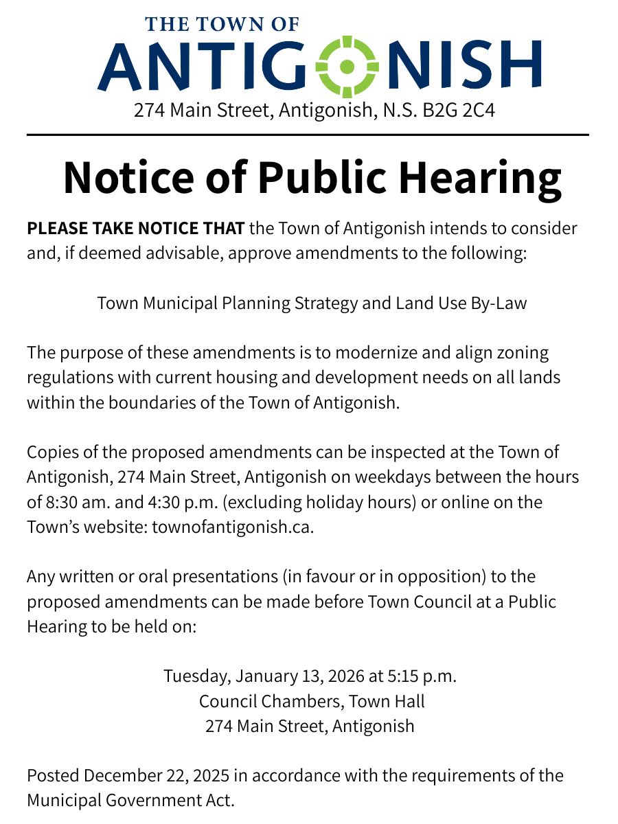 On Tuesday, December 16, 2025, Antigonish Town Council gave First Reading to amendments to the Town’s Municipal Planning Strategy and Land Use By-Law.
