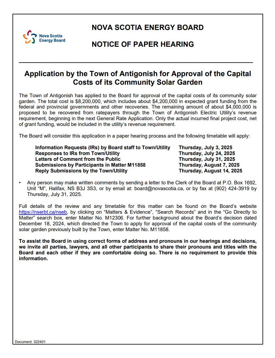 The Town of Antigonish has applied to the Board for approval of the capital costs of its community solar garden. The total cost is $8,200,000, which includes about $4,200,000 in expected grant funding from the federal and provincial governments and other recoveries. The remaining amount of about $4,000,000 is proposed to be recovered from ratepayers through the Town of Antigonish Electric Utility’s revenue requirement, beginning in the next General Rate Application. Only the actual incurred final project cost, net of grant funding, would be included in the utility’s revenue requirement.